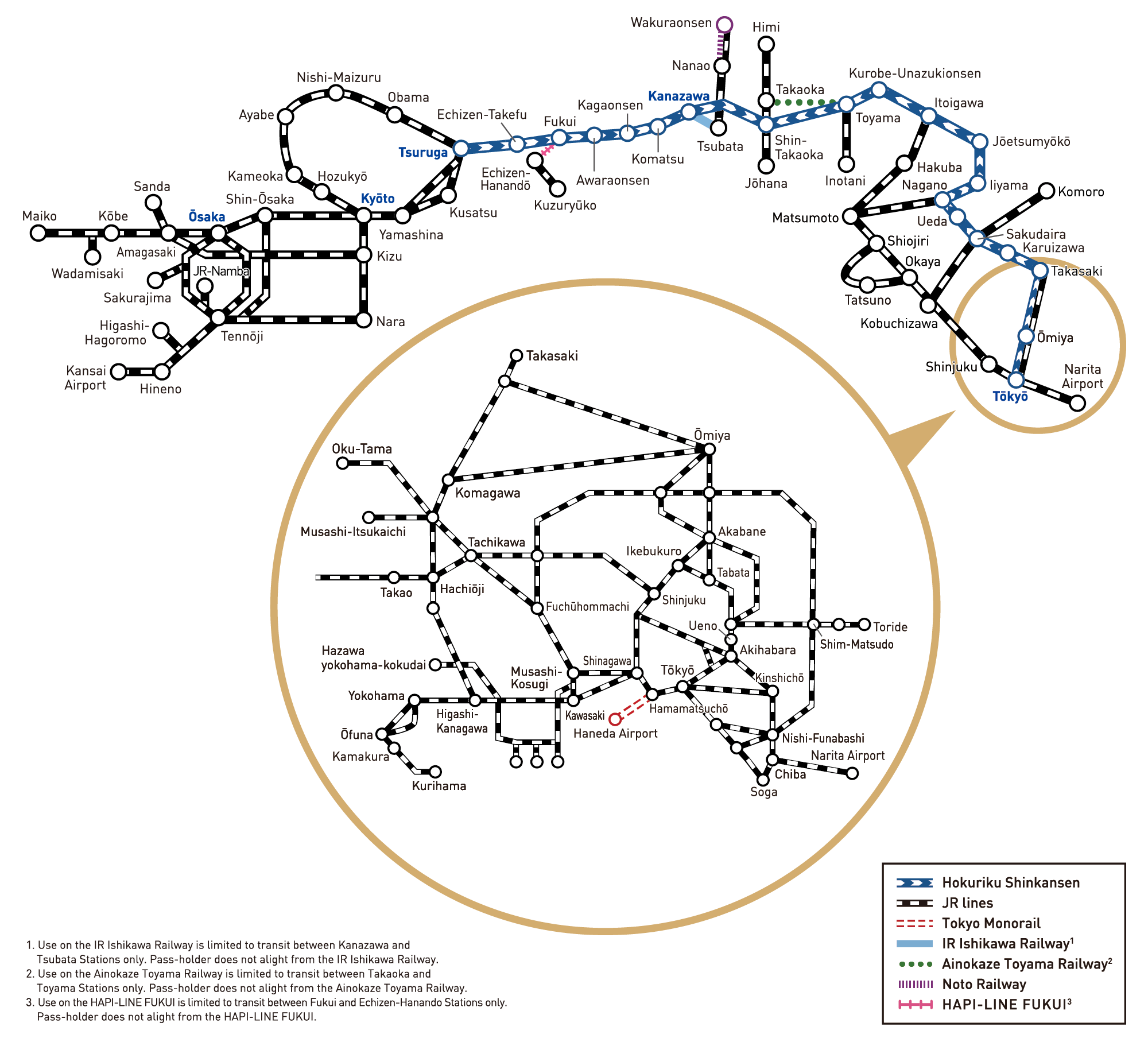 This discount pass allows the holder to use the Hokuriku Shinkansen, limited express trains, and other trains from Kansai, Narita, and Haneda Airports to the Hokuriku region. Valid for 7 consecutive days. Pass holders are also entitled to discounts on tourism facilities, buses and trains in the Hokuriku region, and other benefits.